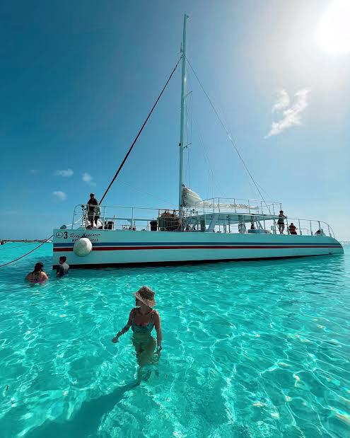 Catamarán con barra libre, snorkel en arrecifes, club de playa y ferry a Cozumel.